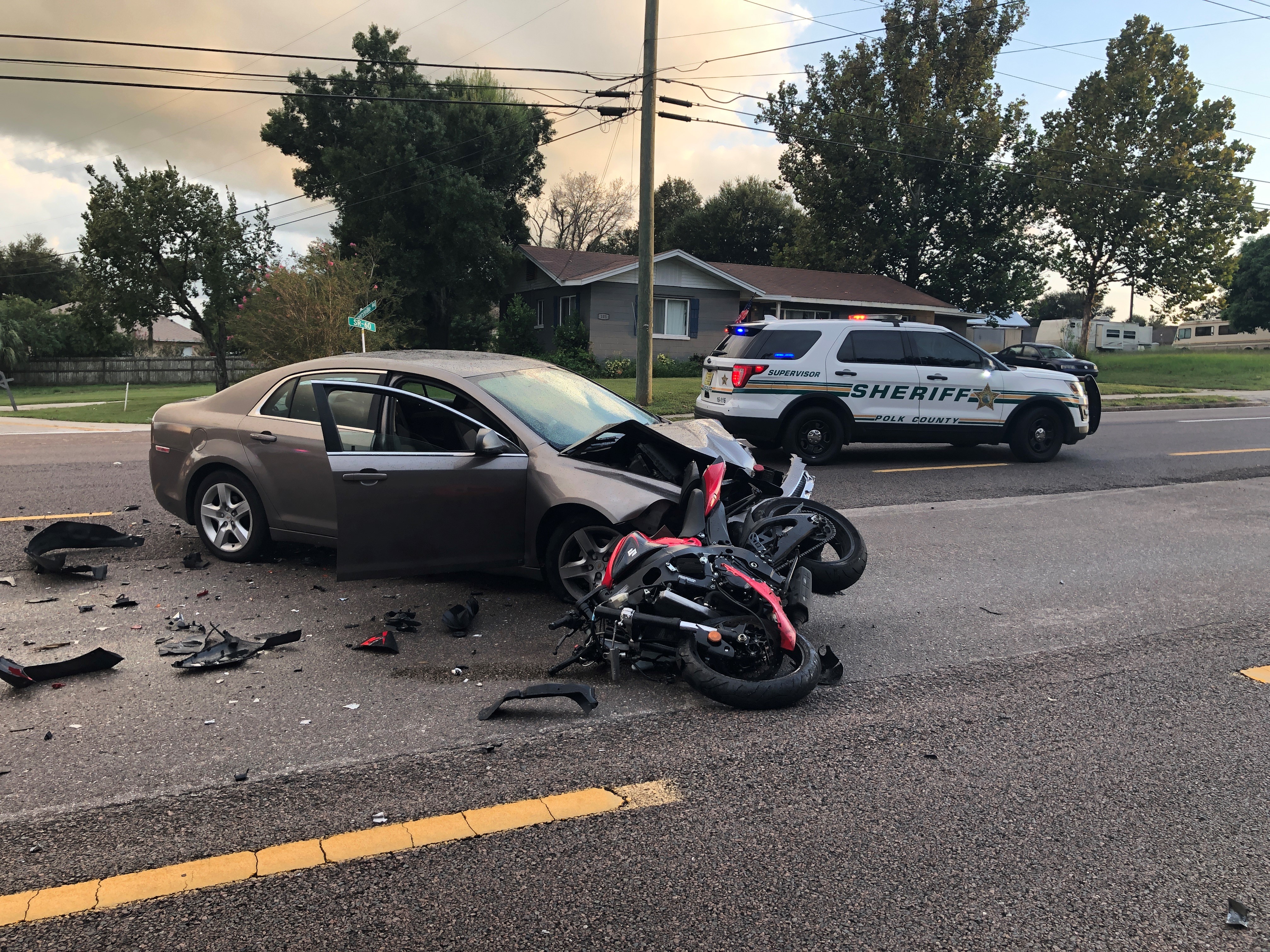 According to the preliminary investigation, 32-year-old Brittany Young of Bartow was driving a beige 2010 Chevrolet Malibu on Old Connersville Road. Ms. Young and her two passengers, 30-year-old Christopher Moore and 29-year-old Anthony Spurlock, both from Bartow, had just left the Connersville Bait and Tackle when they crossed the eastbound lanes of SR 60 and entered into the path of a red and black 2016 Suzuki 600 Motorcycle driven by 21-year-old Blake Adam Gilmore of Winter Haven.